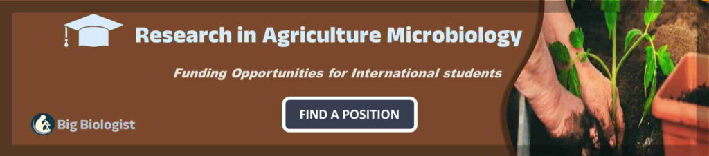 Find a PhD in agriculture microbiology and in its related areas in the UK, USA, Europe, Canada, Australia, New Zealand, etc. Agriculture microbiology PhD programs, scholarships, research projects, fellowships, courses, and positions are available in European countries, Germany, Finland, Belgium, Netherlands, Switzerland, Sweden, Norway, Denmark, Italy, etc. Here you can also find studentships, jobs, courses, offers, and fully funded opportunities for international students abroad. To be notified as soon as a new research position or job offer is posted, sign up for job alerts on Big Biologist.