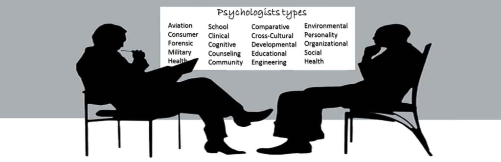 There are many different types of psychologists who specialize in various fields, including those who work in the fields of aviation, consumer, forensic, military, health, school, clinical, cognitive, counseling, community, comparative, cross-cultural, developmental, educational, engineering, environmental, personality, organizational, and social psychology, among others.